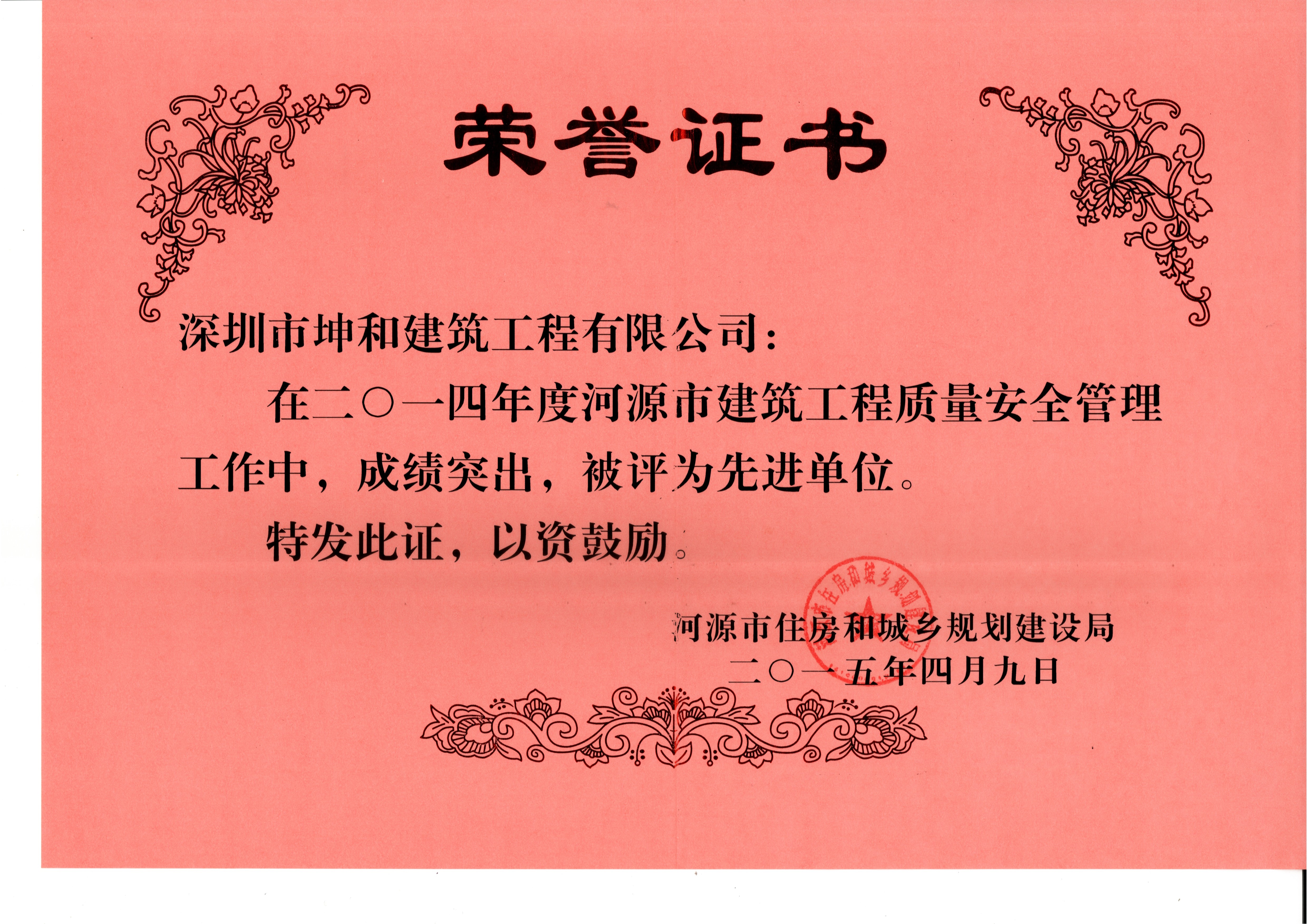 深圳市坤和建筑工程有限公司于二00五年十一月廿八日成立,經過全體員工的共同努力,公司發展迅速,目前公司注冊資金為12010萬元,是一支具有房屋建筑工程施工總承包一級;市政公用工程施工總承包一級;水利水電工程施工總承包二級;地基基礎工程專業承包二級;建筑裝修裝飾工程專業承包二級;建筑機電安裝工程專業承包三級;鋼結構工程專業承包三級資質的專業施工隊伍,并于二00六年通過了ISO9001:2008標準﹑ISO14001:2004標準﹑GT/B2800-2001標準三項管理體系認證。 公司目前擁有各類專業技術人員351人。建筑工程、市政公用工程、水利水電工程、機電工程等各專業注冊建造師99人,注冊造價師5人,高級技術職稱20人,中、初級工程技術職稱和經濟、財會系列的專業人員331人。同時公司設備精良,擁有各類大型工程機械設備391臺,總功率達9600kw以上,這些設備為承接各類工程,確保高效、優質、安全施工奠定了堅實的基礎,是一家擁有全方位施工能力的建筑施工企業。公司多次獲得上級部門的表揚和嘉獎。 公司內部實行計算機智能化管理,建立了一套完善的質量、安全管理體系和制度。嚴格遵守國家規定的各類法律和各項規章制度,積極貫徹以“安全生產、文明施工”為主的生產作業指導方針;始終遵循“質